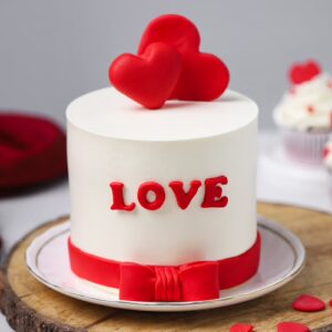 Say it with sweetness this Valentines Day with the Valentines Heartfelt Red Velvet Cake, made for intimate gifting and love-filled moments. Draped in silky white cream, its adorned with two fondant hearts on top, a bold red Love detail, and a charming fondant bow around the base for an elegant finish. With its rich red velvet sponge and picture-perfect design, its a thoughtful surprise for someone special or a sweet treat to share together. This eggless cake is freshly made to order.