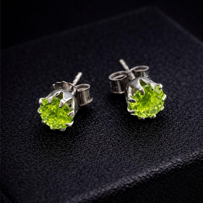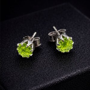 • Gemstone: These earrings showcase round-cut gemstones with a brilliant, neon-green or “olivine” hue. The multifaceted cut is designed to maximize light reflection and sparkle.