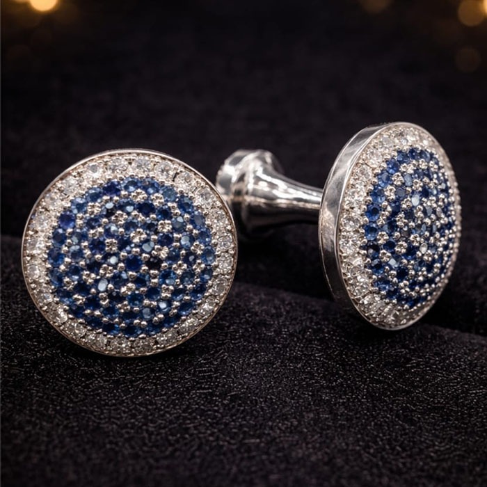 Elevate your formal attire with these exquisite round pave-set cufflinks, designed for the modern gentleman who appreciates the finer details. Featuring a stunning cluster of deep navy blue stones encircled by a halo of brilliant white crystals, these cufflinks bring a touch of luxury to any French cuff shirt.