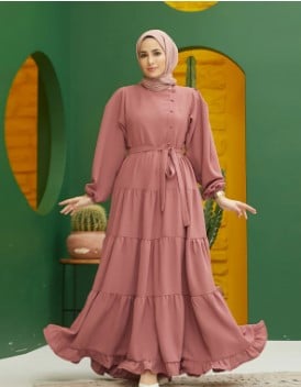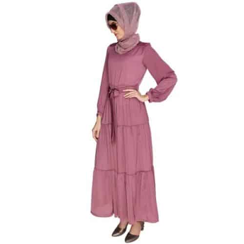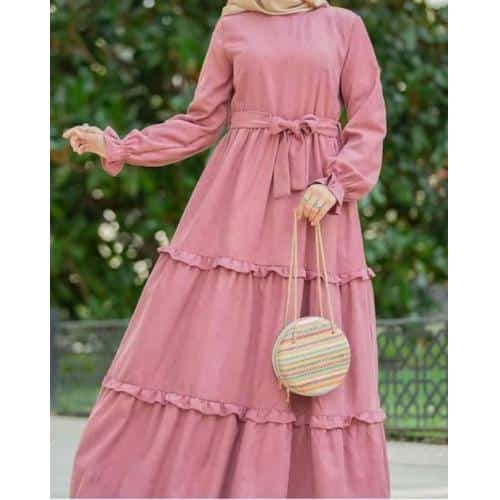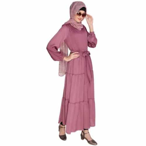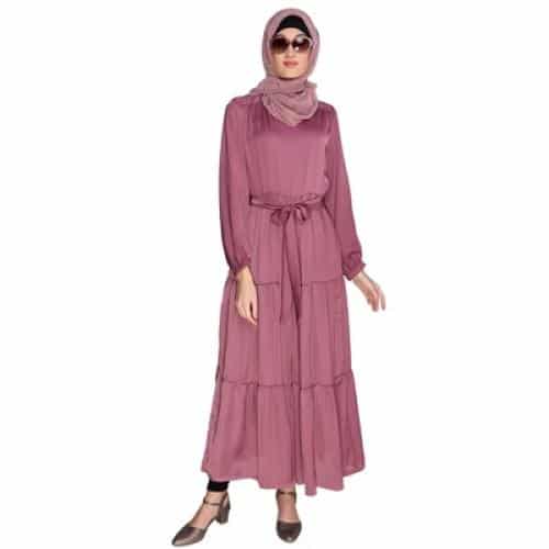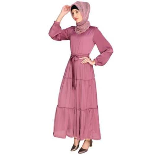 Fabric: Satin.This Is A Premium Fabric, With A Rich Feel & Texture And Is Flowy, Opaque And With A Great Fall.This Dress Has V Neckline.Spruce Up Your Wardrobe Collection With This Three Layered Tier Gathered Maxi Dress This Season.It Adds More Gathers On The Shoulder, Sleeves With Elastic , Collar With Front V Keyhole Neckline. Elegant Body Cut With Belt Making The Outfit More Slimming.The Use Of Silky Satin Fabric Makes It More Lightweight And Flowy. Team It Up With Solid Colour Hijab And Pumps.This Is Front Closed Maxi Dress.The Item Is Without The Accessories (Hijab) Worn By The Model.Colours Displayed May Vary Slightly Due To Changes In Lighting.Wash Care: Dry Clean Only.