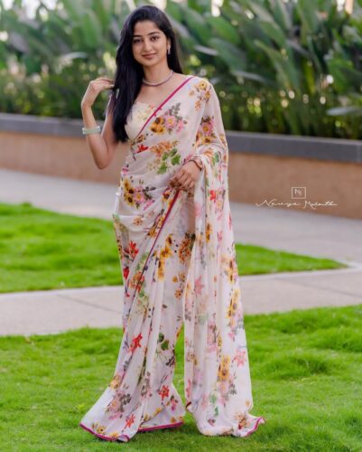 New white color flower Design pure soft Georgette silk with beautiful digital flowers print saree design in All over the body with beautiful lace border withTrendy and grand Beautiful pallu. With Beautiful running Blouse piece with beautiful lace border*