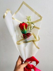 • Wrapping: A modern “Korean-style” wrap using frosted white waterproof paper with a distinct gold border, creating a structured, architectural look.