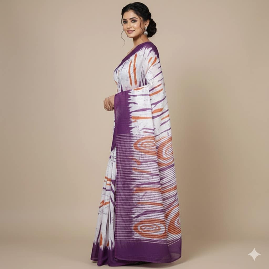 Fabric Type: This is a Batik print saree, characterized by its traditional wax-resist dyeing technique that creates unique “crackling” patterns throughout the fabric.