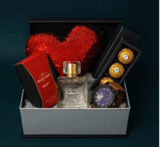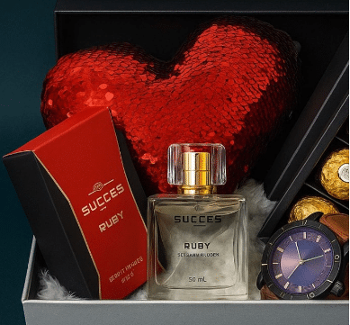 • Fragrance: A 50 ml bottle of “Succes Ruby” Eau de Parfum, accompanied by its red and black retail box.