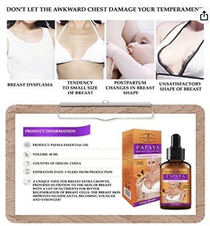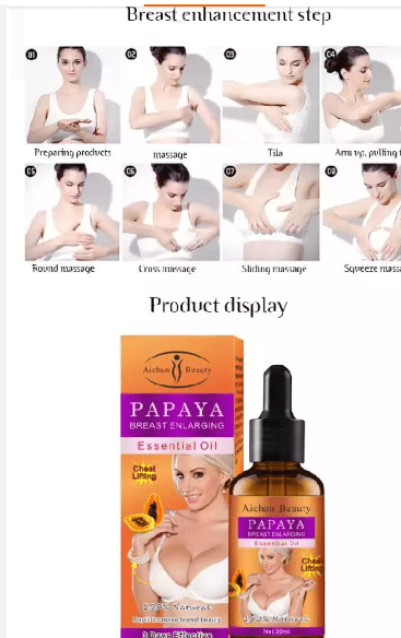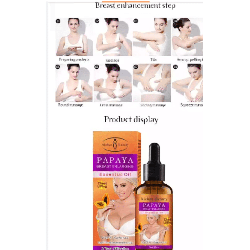 Without the use of surgery, Papaya Breast Enlarging & Firming Oil help women realize their goals of having larger, firmer, and more voluminous breasts. Additionally, it is a natural oil extract. So also, this substance is easily absorbable and easy to use, is completely safe to use, quite effective, and has no negative side effects.
