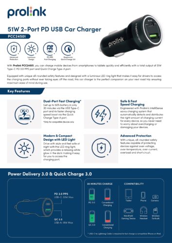 Prolink 51W 2-port PD USB Car Charger