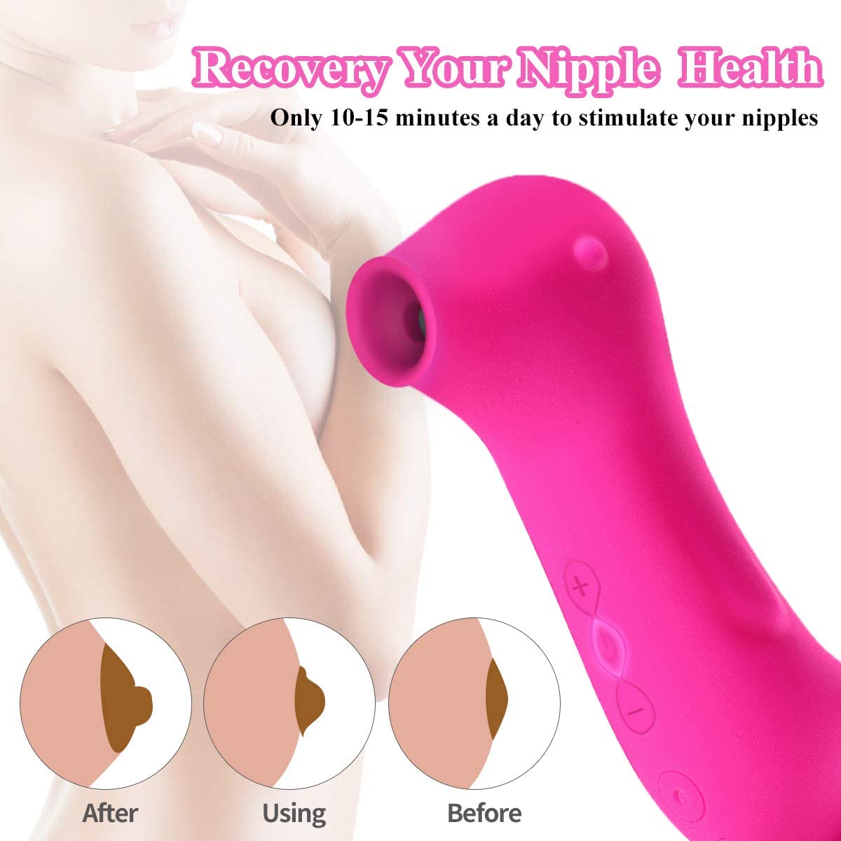 The Clitoral Sucking Vibrator comes with 10 suction modes,designed to simulate realistic oral pleasure including multiple power levels and pulsating patterns to sensitive nerve endings. Simply press the button to start playing and switch different modes.Just like sex, you should start off slow and gentle to help set the mood and give your body time to adjust.Besides,Vibrators to help your nipple daily,only 10-15 minutes a day,recovery your nipple’s health.